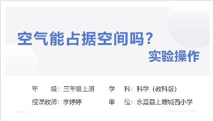 对于三年级的学生来说空气的存在及颜色\状态\气味等特征已经非常了解,但对"空间"是缺乏理解的,为帮助学生建立起"空间"和"物体占据空间"的概念,有序的探究活动十分重要,该视频是指导学生如何操作,观察什么,帮助学生对空气占据空间这一事实做出科学的解释
